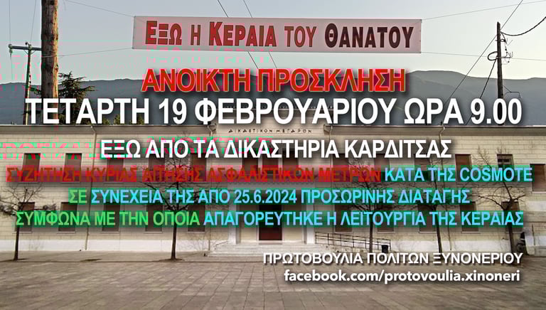 Η Πρωτοβουλία Πολιτών Ξυνονερίου σας καλεί αύριο Τετάρτη 19 Φεβρουαρίου στις 9 π.μ. έξω από τα Δικαστήρια Καρδίτσας στη συζήτηση της κύριας αίτησης ασφαλιστικών μέτρων κατά της Cosmote, σε συνέχεια της από 25/6/2024 προσωρινής διαταγής σύμφωνα με την οποία ΑΠΑΓΟΡΕΥΤΗΚΕ Η ΛΕΙΤΟΥΡΓΙΑ ΤΗΣ ΚΕΡΑΙΑΣ.