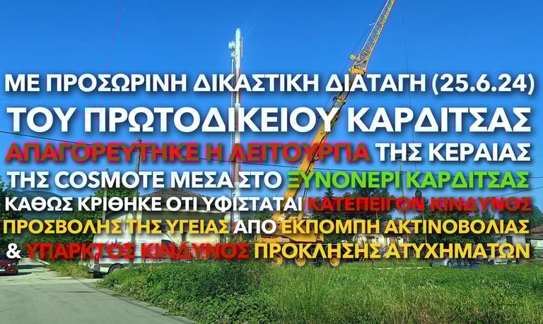 εξεδόθη στις 25-6-2024 προσωρινή διαταγή της κας Δικαστή του Μονομελούς Πρωτοδικείου Καρδίτσας, σύμφωνα με την οποία απαγορεύτηκε η εγκατάσταση και λειτουργία κεραιοδιάταξης κινητής τηλεφωνίας επί πυλώνα ύψους 30 μέτρων εντός του οικιστικού ιστού της Τοπικής Κοινότητας Ξυνονερίου του Δήμου Καρδίτσας (όπου επιχείρησε να εγκαταστήσει και λειτουργήσει στο σημείο αυτό, εταιρεία τηλεπικοινωνιών), μέχρι τη συζήτηση της κυρίας αιτήσεως που θα πραγματοποιηθεί την 25-2-2025, ενώπιον του Μονομελούς Πρωτοδικείου Καρδίτσας.