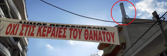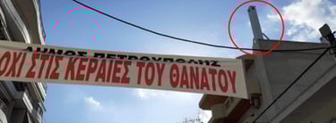 Βέβαια, σε άλλες περιοχές της δημοκρατικής Ελλάδος παρόμοια πανό όχι μόνο δεν διώκονται, όχι μόνο υποστηρίζονται και σθεναρά μάλιστα από τις τοπικές αυτοδιοικήσεις αλλά κατασκευάζονται και αναρτώνται με πρωτοβουλία και έξοδα των ίδιων των τοπικών αυτοδιοικήσεων (!), όπως στην περίπτωση του Δήμου Πετρούπολης (παρατίθεται παρακάτω φωτογραφικό στιγμιότυπο όπου επάνω δεξιά διακρίνεται σε κύκλο η κεραία καμουφλαρισμένη σε καμινάδα!...)