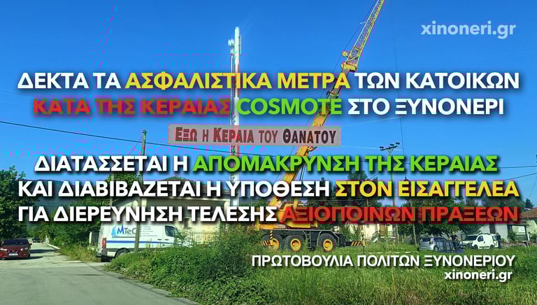 Ως αποτέλεσμα του δικαστικού και όχι μόνο αγώνα που ξεκίνησε η Πρωτοβουλία Πολιτών Ξυνονερίου Καρδίτσας ενάντια στην κεραία κινητής τηλεφωνίας που εγκαταστάθηκε – ερήμην ημών των απλών πολιτών – στη μέση του χωριού μας, ανακοινώνουμε με μεγάλη ικανοποίηση ότι την 31-3-2025 εξεδόθη η υπ’ αριθμ. 95/2025 απόφαση του Μονομελούς Πρωτοδικείου Καρδίτσας, σύμφωνα με την οποία: